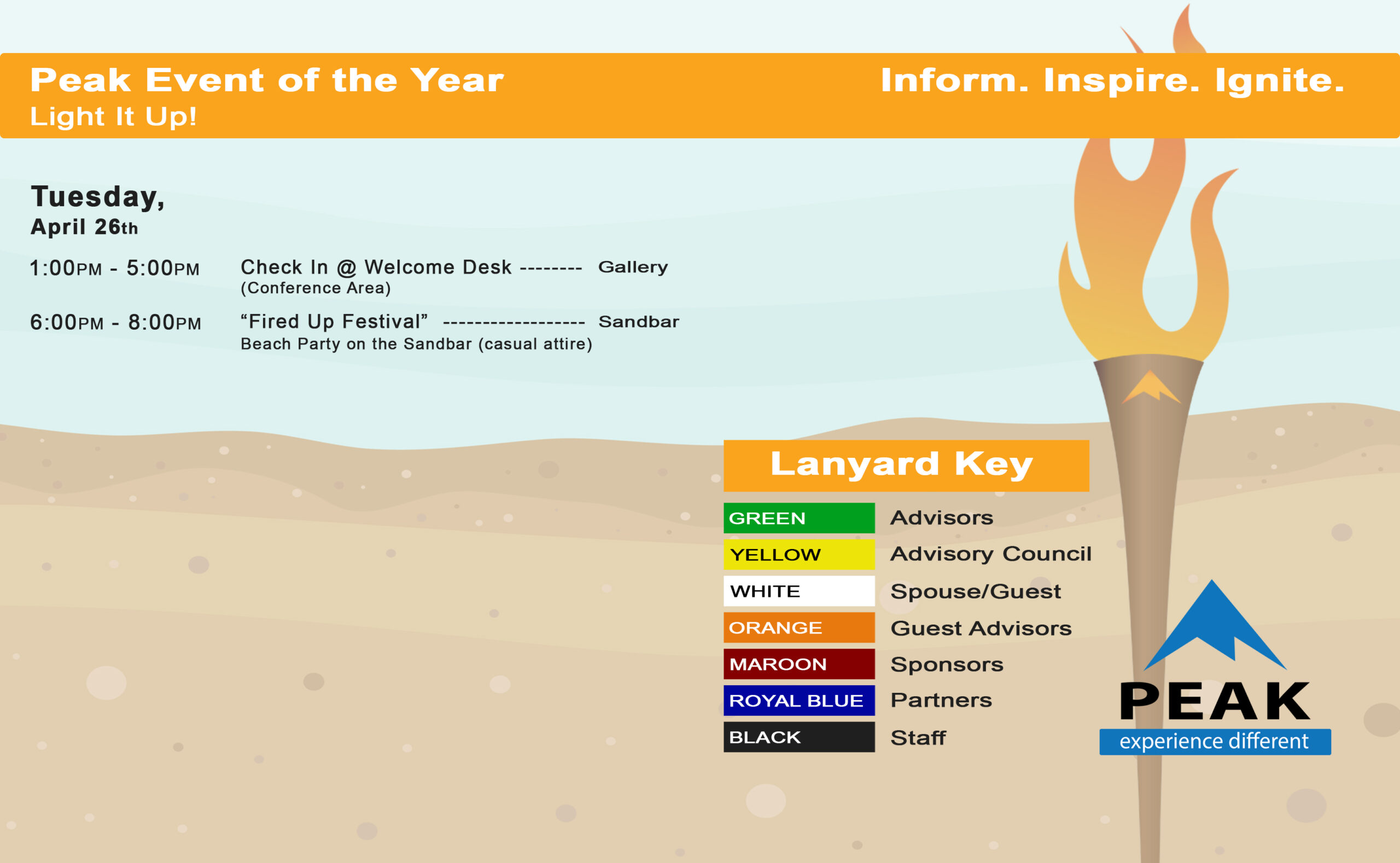 Tuesday begins with Check In at the Welcome Desk from 1pm – 5pm. Then join us for our “Fired Up Festival” beach party on the Sandbar from 6pm to 8pm.